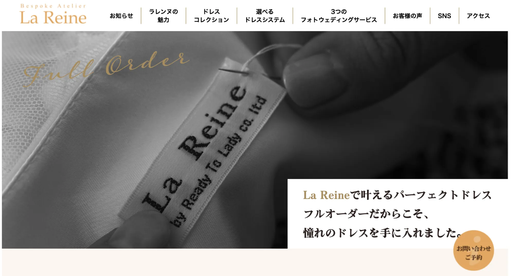La Reine(ラレンヌ)は、熟練の職人によるフルオーダーウェディングドレスを手がけるドレスアトリエで、完全ハンドメイドによる一点物のドレス制作を行っています。25年以上の経験を持つデザイナー桃世氏が主宰し、5000人以上の花嫁のドレスを手掛けてきた実績があります。