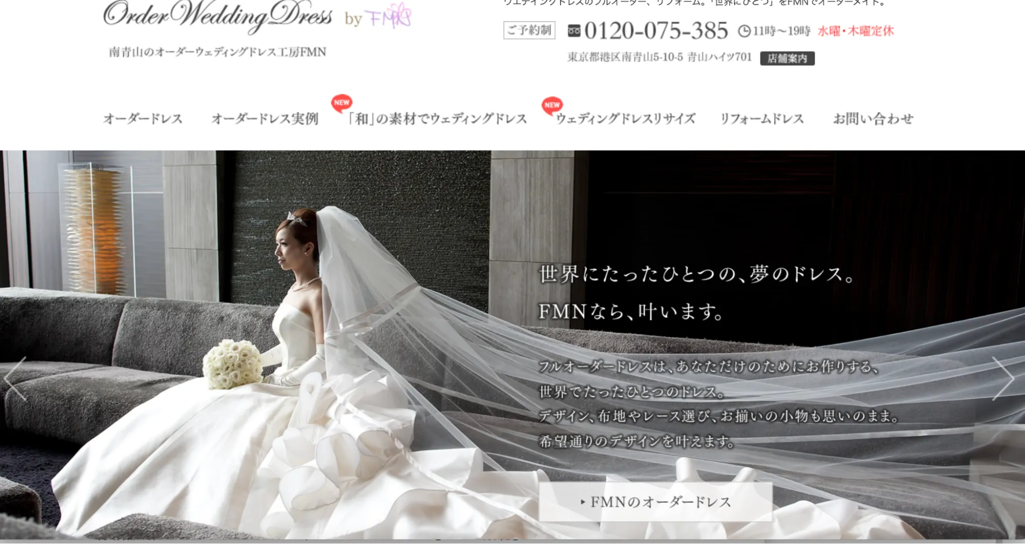 FMN(エフエムエヌ)は、東京都港区南青山にあるオーダーメイドウェディングドレス工房で、フルオーダーからリメイクまで幅広く対応するアトリエです。伝統的な職人技と現代的なデザインセンスを兼ね備えた制作を特徴としています。