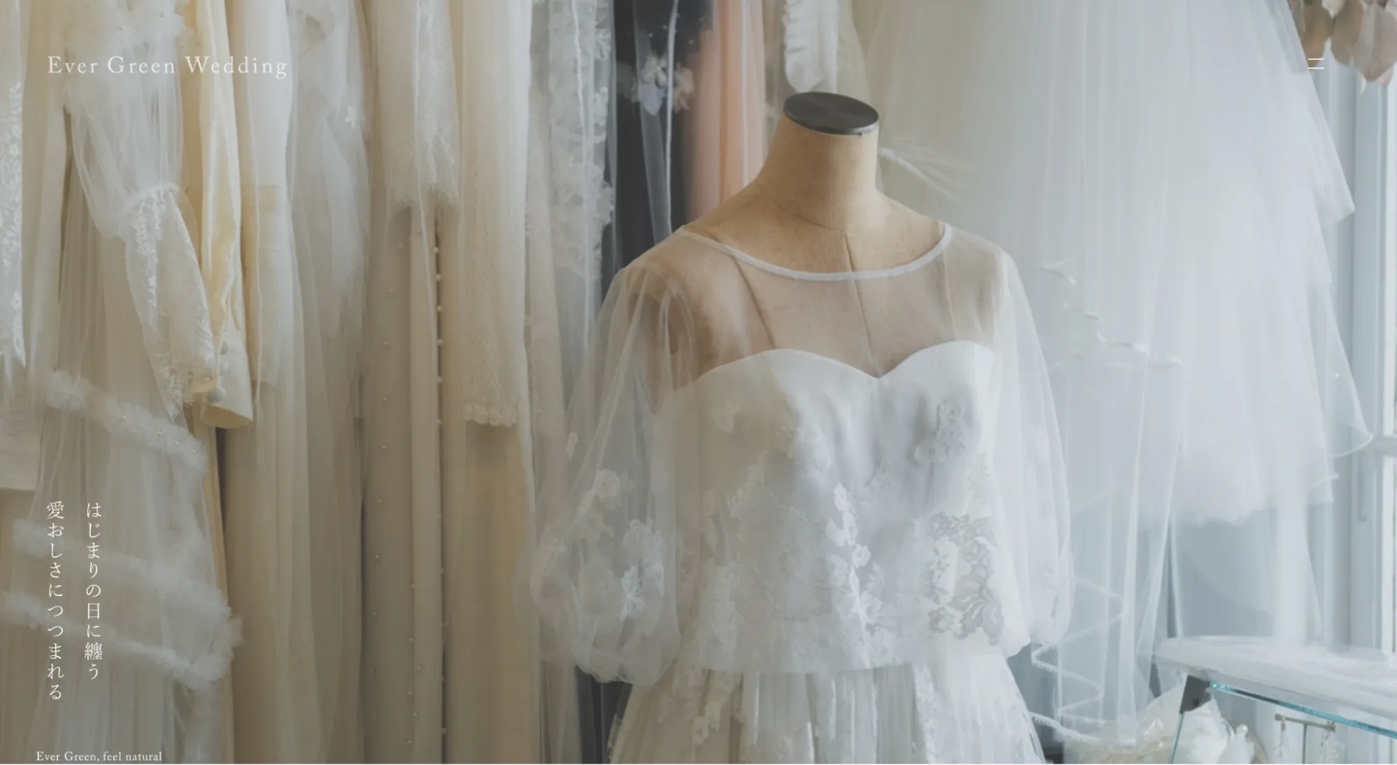 Evergreen Weddingは、「feel natural(自然体の美しさ)」をテーマに、自然の色・質感・光を大切にしたオーダーメイドウェディングドレスを手掛けるブランドです。神奈川県横浜市のサロンと湘南のアトリエを拠点に、丁寧な手仕事によるドレス制作を行っています。