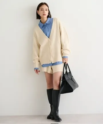 ローゲージでオーバーサイズのカーディガンは重心が下がって見えがちなため、ボトムスは思い切ってミニ丈の台形スカートやショートパンツを合わせるのが正解です。