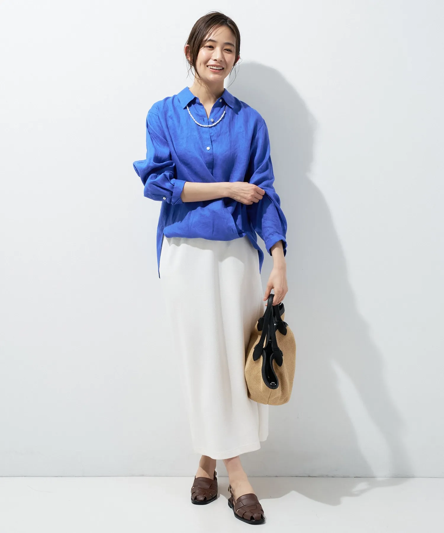 中はタイトめなキャミソールワンピースを合わせることで、Xラインを作りつつ、外側のシャツでふんわりと身体を包み込みます。この「透けて見える華奢なライン」が、ウェーブさんの魅力を最大限に引き出します。