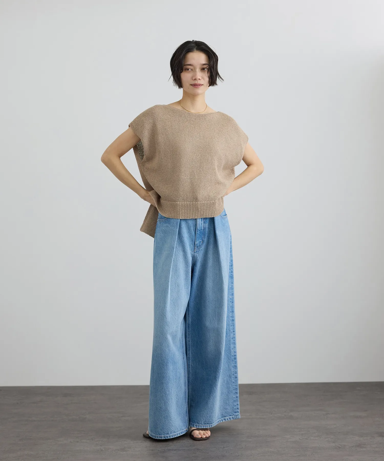 上半身にボリュームが出る分、下半身の重心をあげることで、ローゲージ特有の「重たさ」が中和され、ウェーブさんらしい華奢さが際立ちます。