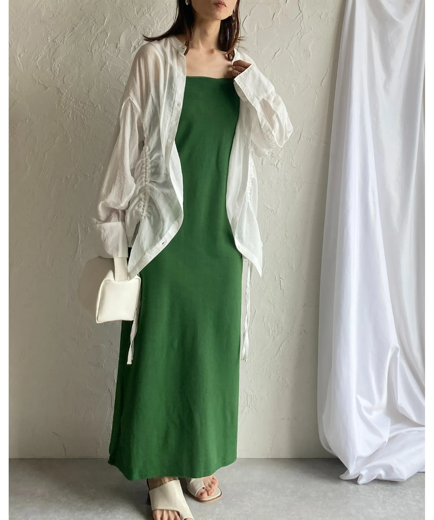シアー素材のオーバーシャツ × 華奢ストラップのキャミワンピ