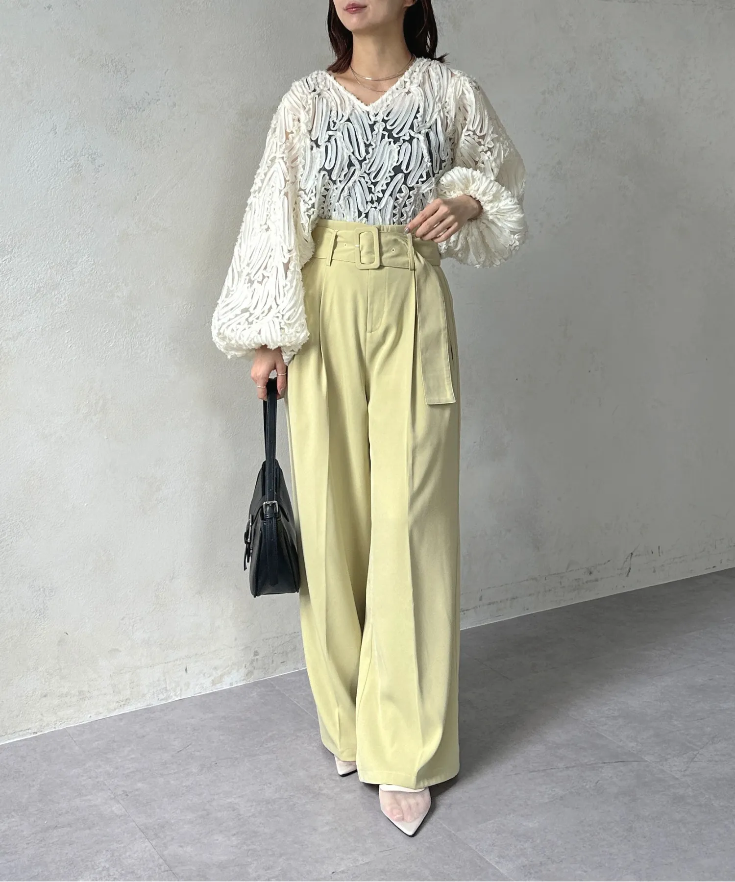 上半身に横のボリュームを足しつつ、ウエスト位置を高くキープできるため、脚長効果が抜群。ワイドパンツと合わせれば、女性らしさと今っぽさを両立した最強のデート服になります。